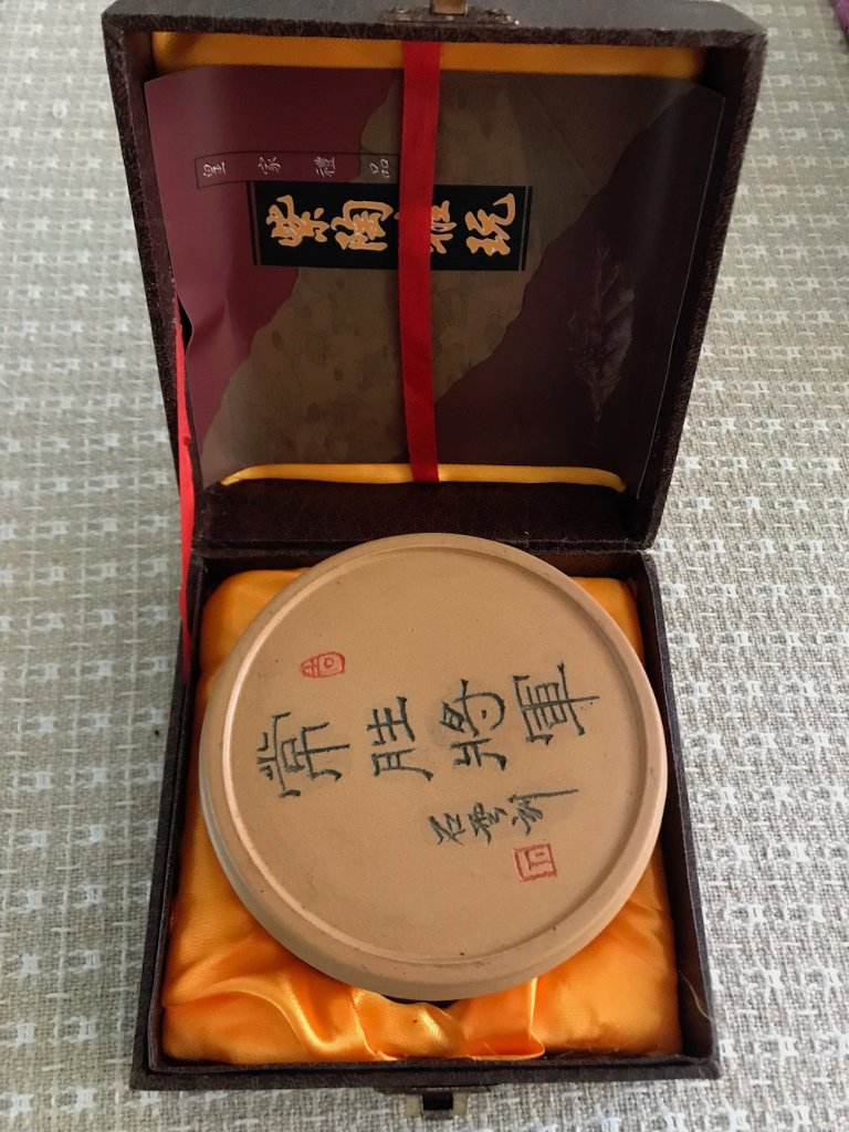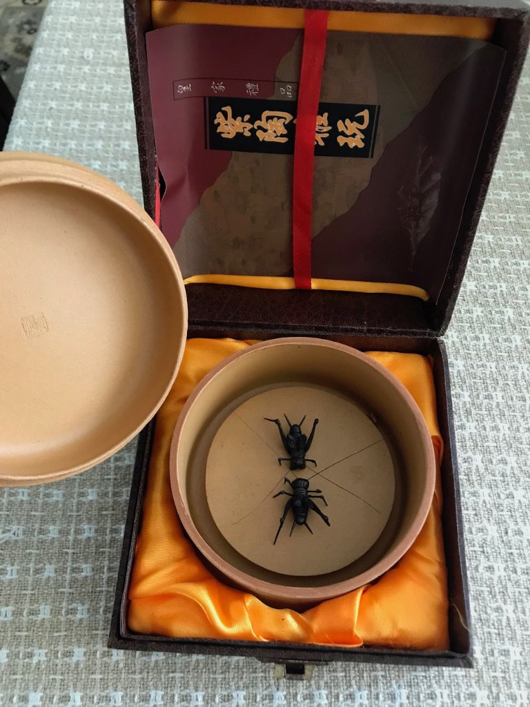 My name is Denise and I'm from Maui, where I was given (maybe at a garage sale?) a curious item. It's a satin-lined box with a clay pot inside that holds two metal crickets. When I went to research what was written on the box (Zi Sha Zhen Pin) all I found were teapots. I have not been able to find anything like this (though I did learn a bit about the Chinese cricket fighting... interesting!) Someone at UH suggested that it could have been a gift from a visiting dignitary, which makes me wonder whether it might be worth something.