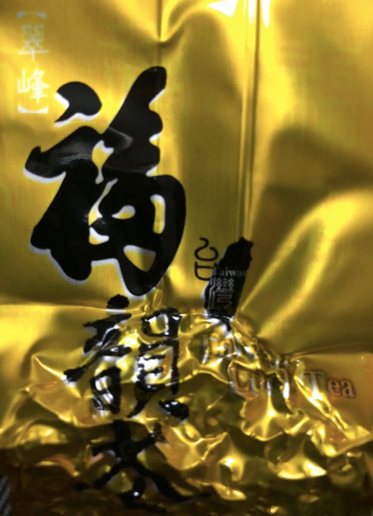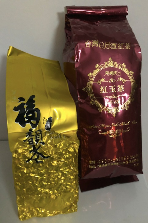 The golden-yellow bag is most likely Cuì fēng oolong, Cuì fēng being the region from where the tea comes. The brown bag is black tea, Red Jade or Tai-tea#18.