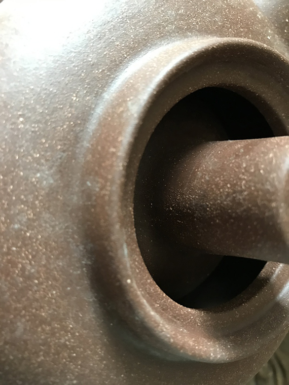 For sale is this peculiar clay kettle. A bit difficult to describe, it has a inward canal from the bottom, thus making water heating a lot fast due to the larger surface exposed to the source of heat. Heating up inside out so to speak.