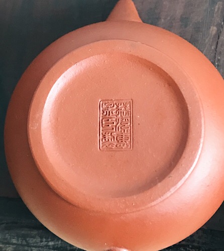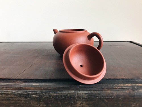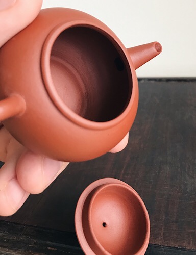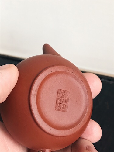 Thin walled and with the excellent and lovely, creamy red clay the 60s are famous for. It had the original wax coating that was sometimes used back then, so this means it is in pristine, unused factory condition. I boiled it off nonetheless to check the state of the clay. Same as the previous one, it turns dark red fast when filled with hot water. A good candidate for high mountain oolong, Yancha, or any other tea that is so expensive that you prefer to enjoy it in small quantities. Thin like that and raised over a period of time, it can also be a good substitute for Zhuni clay.