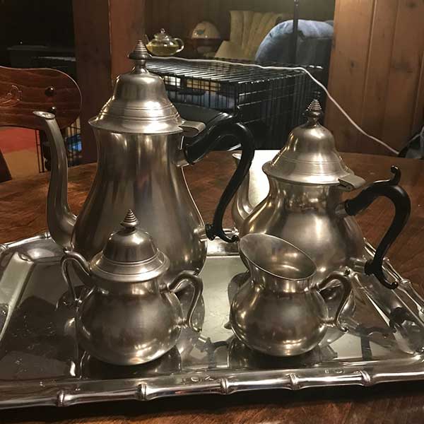 This is the Royal Holland Sleepy Hollow tea set, which is an 80's restoration (i believe) piece based off of a 18th century service set from New York. It's made out of pewter, and has bakelite handles on it.