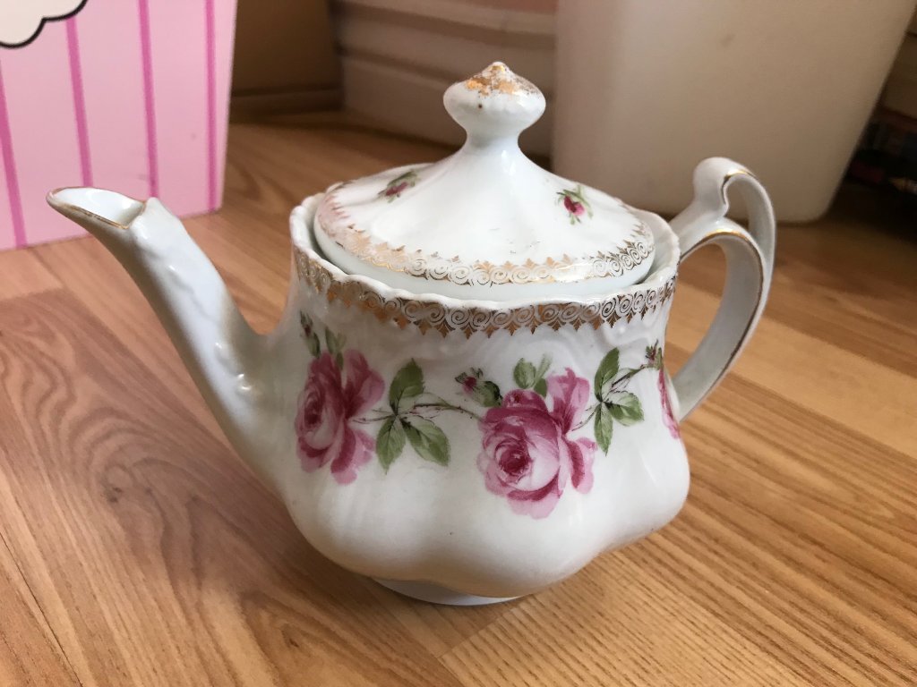 I bought a small teapot at an antique store in Arizona, USA a few months ago, and I've been trying to figure out how old it is ever since. It is shaped kind of like a pumpkin and has pink roses around the sides. I am pretty sure it is porcelain and I think it is old because it has gold trim, but a lot of it has been worn off. You can tell that in a lot of places there was once gold trim and small fleur-de-lis patterns. The handle is curved with a small second curve on top of it, and there is one main hole leading to the spout. There is some sort of identification stamp on the bottom, but I can't make it out. I would appreciate any knowledge from anyone who thinks they know how old it is, what type, etc. Some photos are attached. Thanks!