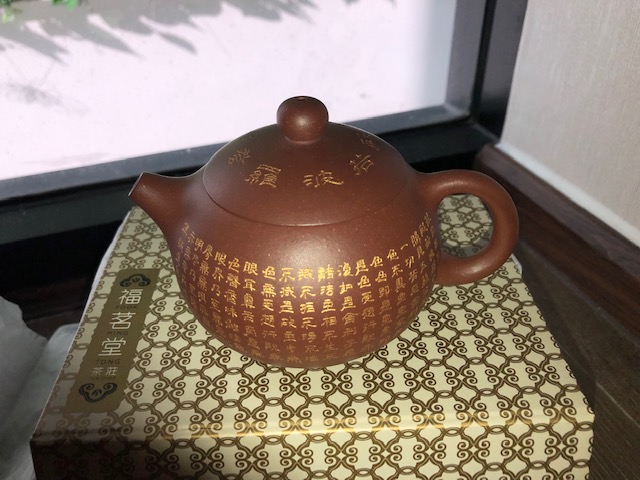 please correct me if anyone more knowledgeable comes around. The shape of the teapot is called Xi Shi, named after one of the four renowned beauty of ancient china. For this reason the curves are very round and feminine. The shape is a bit off from other Xi Shi I've seen, the knob appears a bit large and the handle is a bit chunkier than I typically see. If the yixing clay is real, it is likely zisha (also called zini) clay. This translates to purple sand. It comes from a dark purple ore mined in one of the three authentic mountains in Yixing China (Yellow Dragon Mountain, Blue-Green Dragon Mountain, and I forget the other one). There are many different philosophies regarding which teas to pair with zisha. Imo, the clay tends to mitigate and 'clean-up' teas, so I usually put it with teas that need some refining (Shou puerh, highly roasted oolong, maybe some intense sheng puerh). Many will disagree with this though. As far as the carving, I can't read chinese but it was common to engrave the buddhist heart sutra into the sides yixing teapots, so I suspect it is this. I can't say for sure whether it is real or not, I'd recommend finding as much authentic yixing as you can and comparing the texture of the clay, shape, and color to find out more.