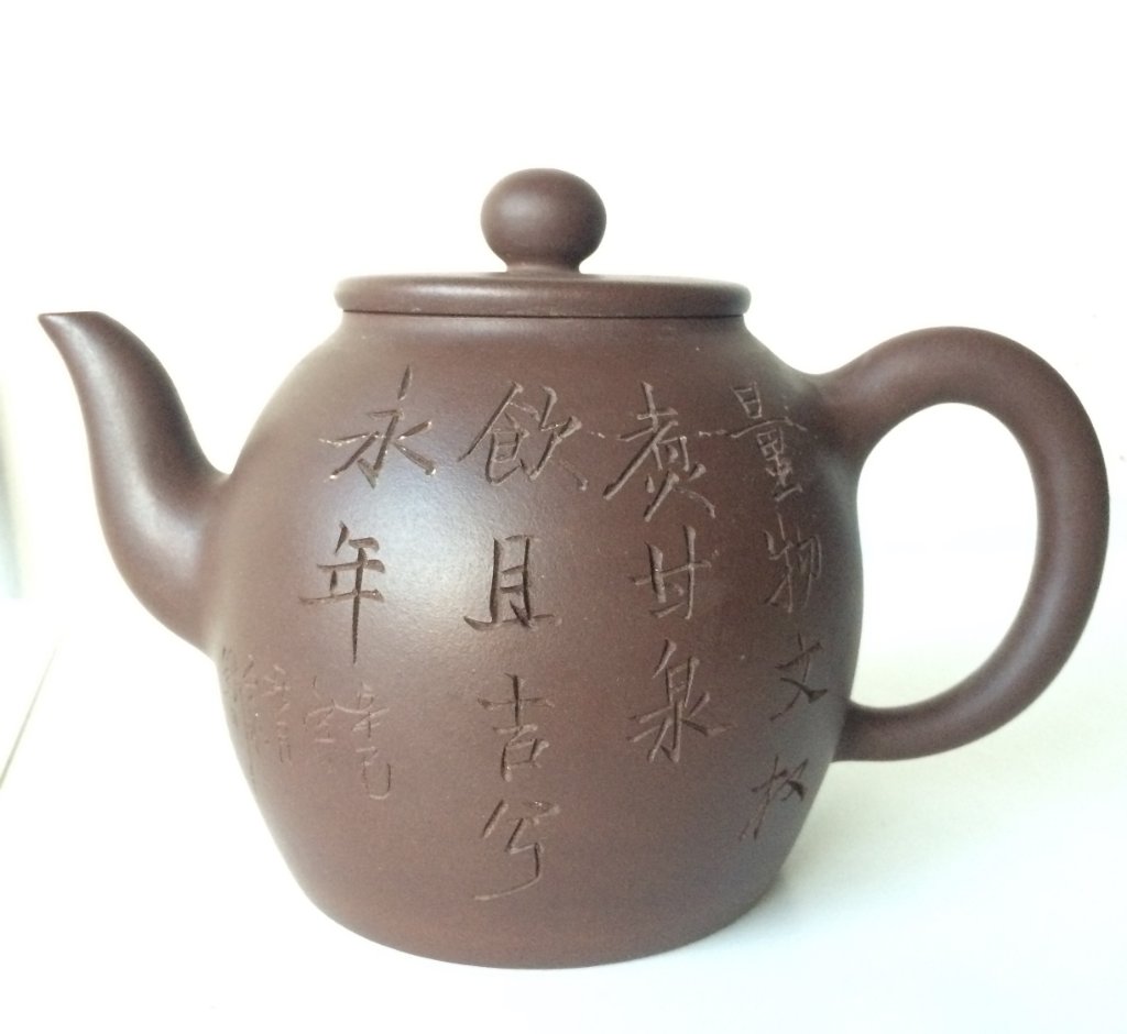 This zi ni (purple clay) Teapot has a seal mark of 洁萍(Jie Ping), and from its style and carving, is an attempt by the artist to recreate a look of antiquity, which can be appealing to select hobbyists. This Teapot is probably made close to the year you received it in, and the carved poetry is more decorative in purpose, to inject a scholarly feel to a tea brewing session.