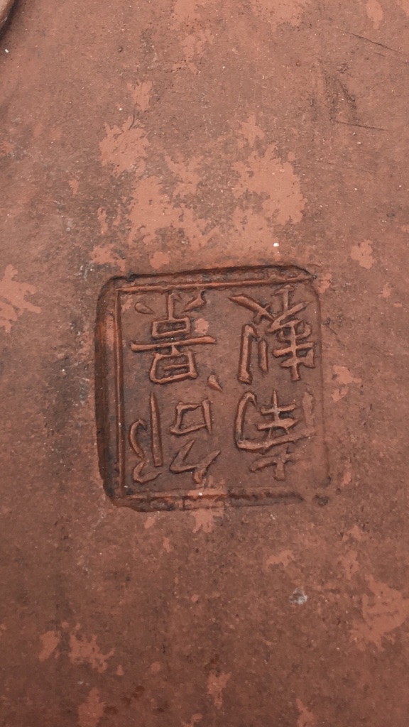 The teapot has one stamp in the lid and another on bottom. The brown cups have a different stamp than the teapot, although I believe all cups go together.No stamp on the rock/clay looking cups. Anything positive to help my search will be appreciated. I will resize my photos to upload.