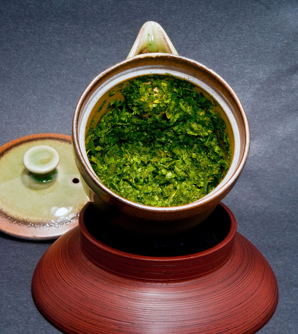 Proinsias's note prompted me to brew the second half of my Tencha. This is really good stuff. Thanks again, Pentox! Here's the wet leaves. It looks looks like a Florida swamp: