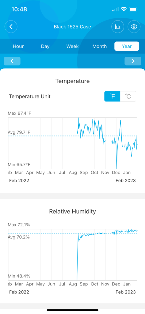 This is in a Pelican 1525 Air case, which I’ve found to be a pretty good size for something I don’t expect to have huge loads of (this one is for heicha, and it seems I did undershoot the size a bit because it is chock full now). The 1557 Air cases are full treasure-chest size and excellent for larger quantities, but I recently switched the hygrometers out in them and due to app limitations I don’t have a longer history.