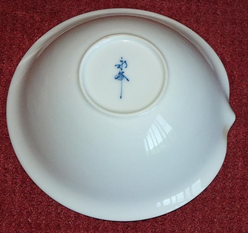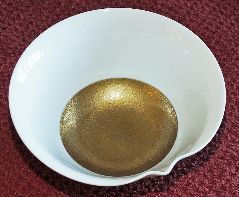 A tea-friend has been using a pair of these elegant gilt-porcelain objects, ca. 4" (95 mm) x 1.8" (45 mm) deep, as cups. They seem intended for pouring, so I thought they might be yuzamashi - but the spouts are pretty small. Perhaps nothing to do with tea at all? (They might be good for drizzling raspberry syrup on ice-cream, or perhaps taking tiny sips of wine.)