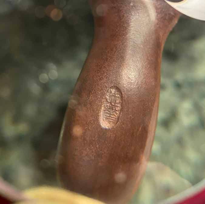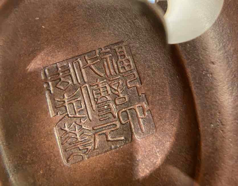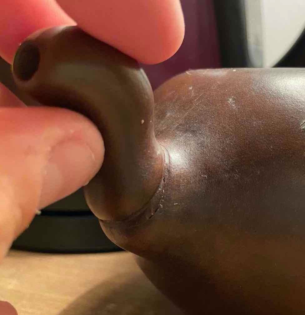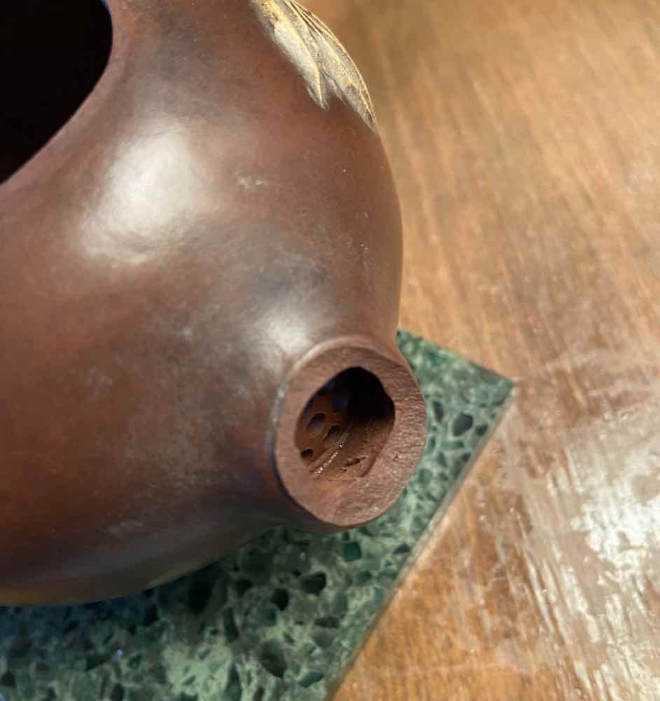 The two stamps were what made me think this may be a handmade piece. The spout had been glued back on, I took it home, gave it a gentle warm rinse, whatever glue was used dissolved and the piece came off gently in my hand. I'm hoping there may be a way to get it professionally repaired if I find this to be genuine and deem it worthy.
